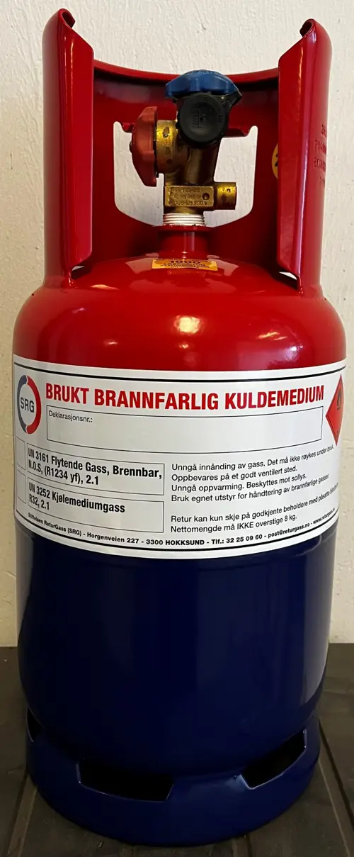 Hydrokarboner (R290, R600 og R600a) skal kun fylles på egnede beholdere. Isovator har komposittflasker med rød topp til dette formålet. Flaskene leveres til avd Hokksund på lik linje med andre kjølemedier og håndteres videre internt i Isovator.
