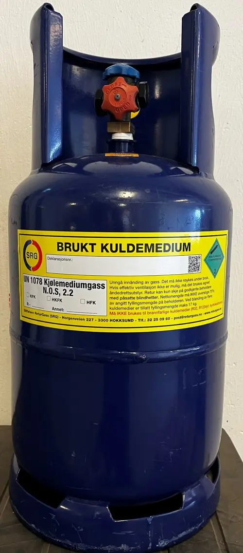 Inneholder beholderen totalt mindre enn 2 kg gass? Hvis svaret er ja, utbetales det ikke statlig refusjon (for HFK/PFK). Gassen kan innleveres vederlagsfritt til SRG. Dersom en beholder inneholder en samlet mengde > 2 kg og samtidig < 2 kg HFK vil det likevel utbetales statlig refusjon for den andelen HFK/PFK som er i beholderen med fratrekk for behandlingskostnader pr. kg iht prislista. Til info: SRG overfører innholdet av innlevert gass fra beholdere med mindre enn 2 kg gass på store tanker og deklarerer avfallet til myndighetene. Dette gjøres for å effektivisere den interne driften i selskapet. Ønsker kunden likevel å gjøre krav på refusjon ved innlevering under 2 kg, belastes det en tilleggskostnad for kjemisk analyse og en behandlingskostnad pr. kg iht prislisten.