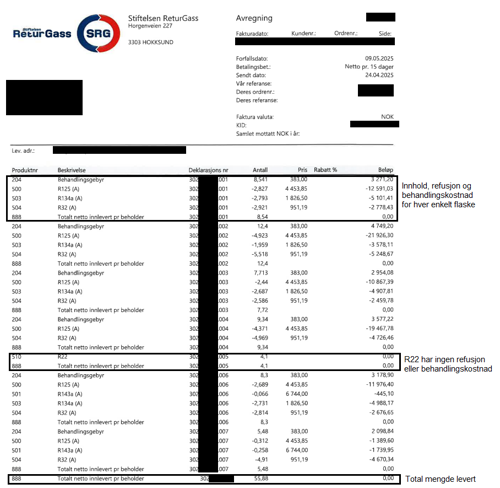 Avregningene viser innhold, refusjon og behandlingskostnad for hver enkelt flaske i en deklarasjon. Se eksempel.